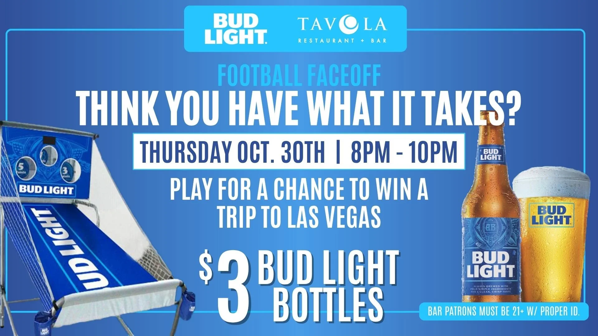 Think you have what it takes? Join us Thursday, October 30th from 8–10 PM for your shot at winning a trip to Las Vegas! Plus, enjoy $3 Bud Light bottles all night.